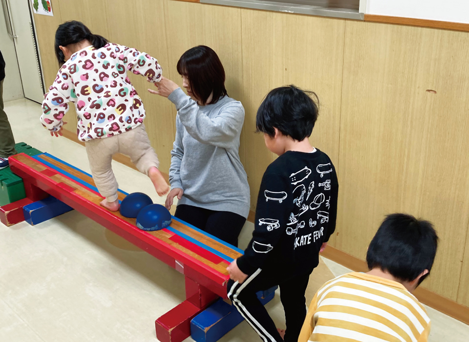 作業療法士(非常勤講師)の助言・指導を元に、運動遊びや感覚遊びの活動プログラムを取り入れ、体幹の弱さや手先の不器用さの改善を図ります。