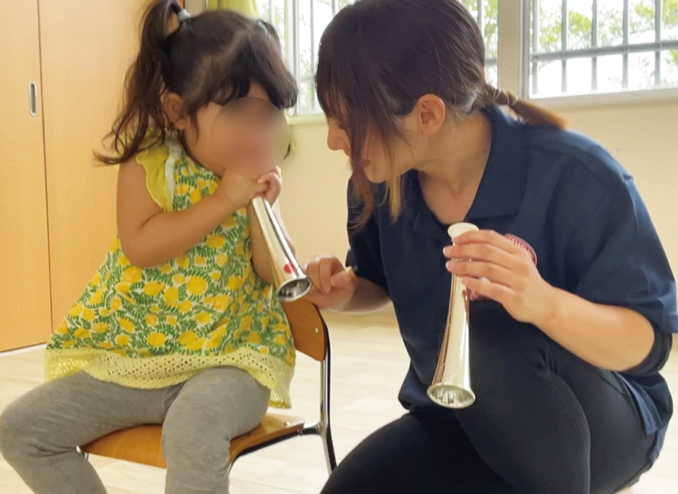 音楽療法士が歌や楽器を活用して、子ども達の運動発達を促し、コミュニケーション意欲や発声を引き出す音楽遊びを提供します。