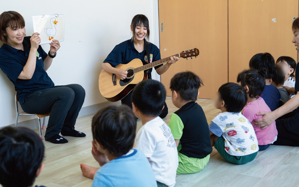 音楽療法士が歌や楽器を活用して、子ども達の運動発達を促し、コミュニケーション意欲や発声を引き出す音楽遊びを提供します。